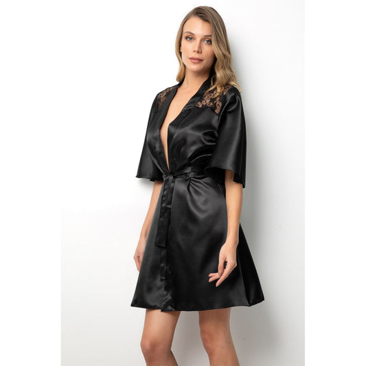 Lace Women's Satin Dressing Gown Kimono - Luxury Half-Sleeved Black Soft Dressing Robe - Lace Trim on The Shoulder and Back Kimono Robe