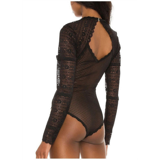 Sheer Lace Long Sleeve Bodysuit Bustier - Black Seductive Keyhole on Front and Back Transparent Fishnet Lingerie - Sexy V-Neckline Gift