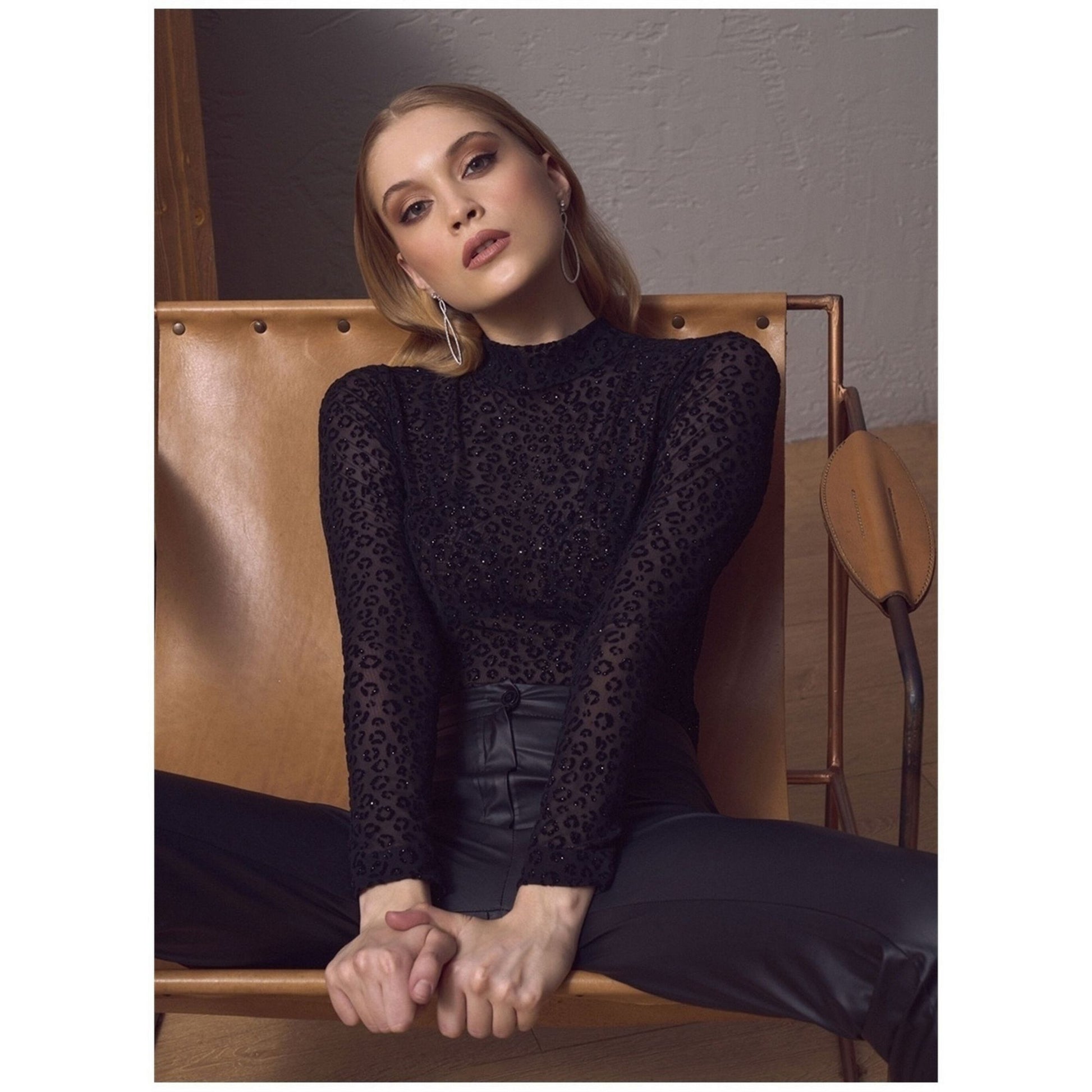 Think of a seductive dress that you can don both frequently and on special occasions. You need this long-sleeved black lace bodysuit, which is semi-sheer. By pairing it with various outfits, you can wear it both throughout the day and at night. Lace with a leopard print can help you stand out as a woman. With this long-sleeved, translucent black body suit on, you'll look gorgeous!