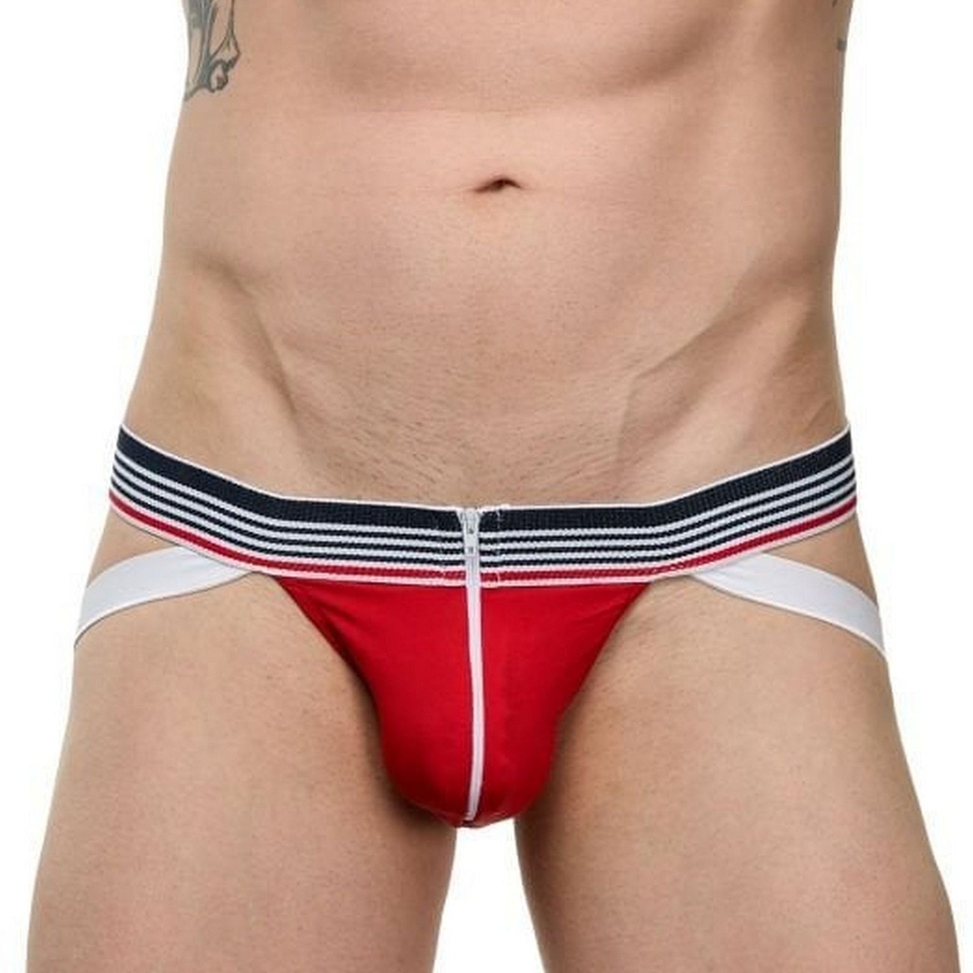 The Sexy Thrills Red, White and Black Striped Zippered Men's Jockstrap-Suspension G-String Underwear is sure to act as a mood-enhancer as you slip it on!