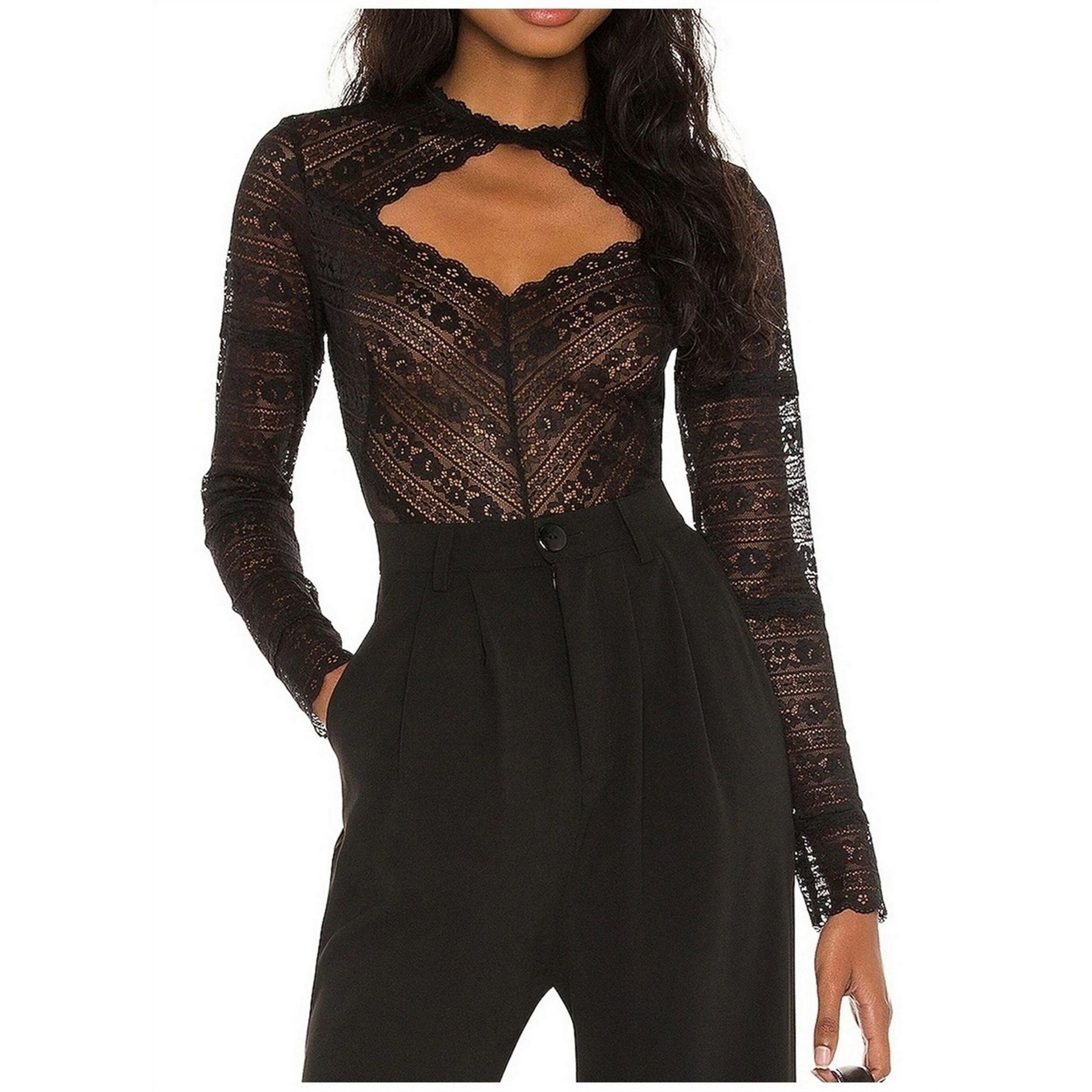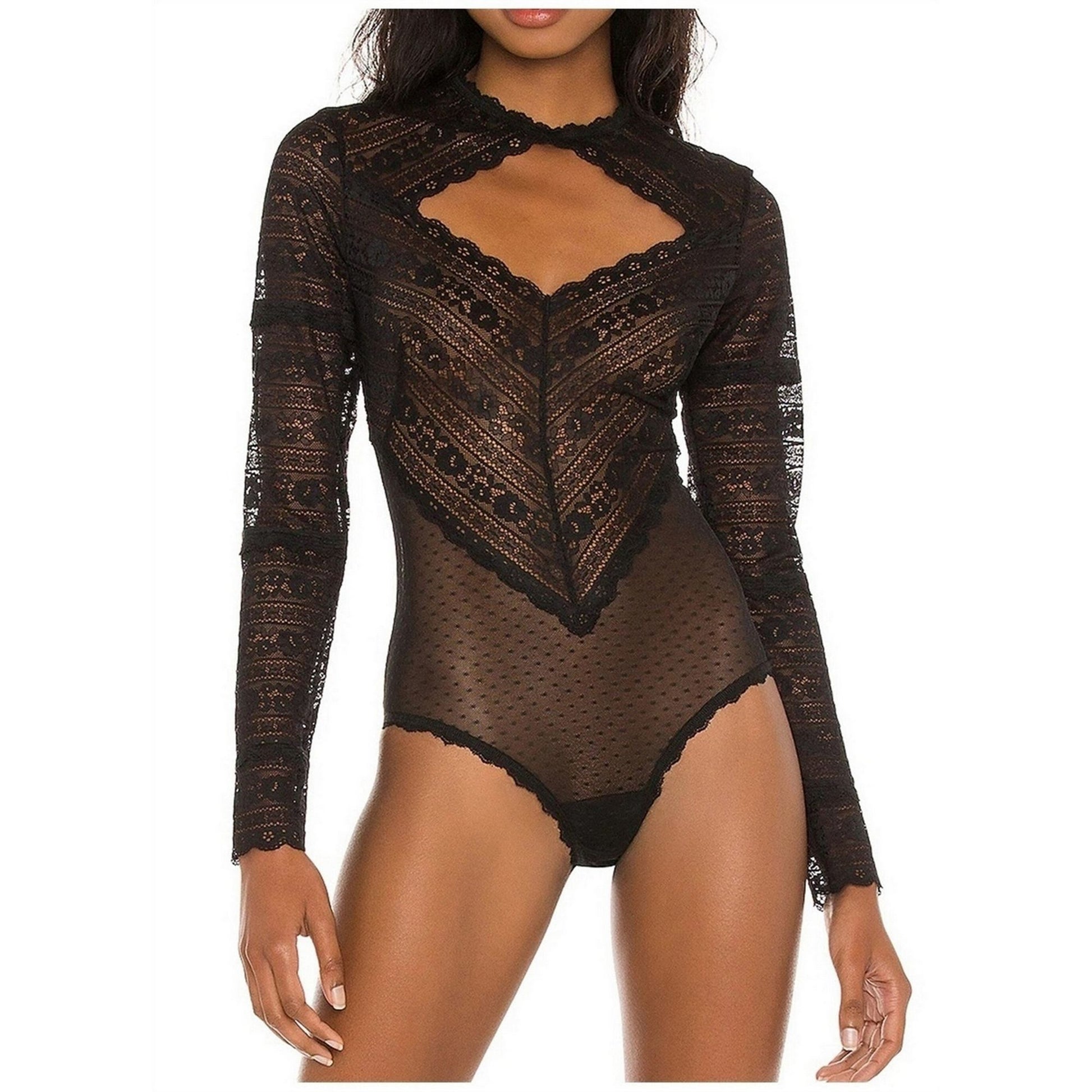 Sheer Lace Long Sleeve Bodysuit Bustier - Black Seductive Keyhole on Front and Back Transparent Fishnet Lingerie - Sexy V-Neckline Gift